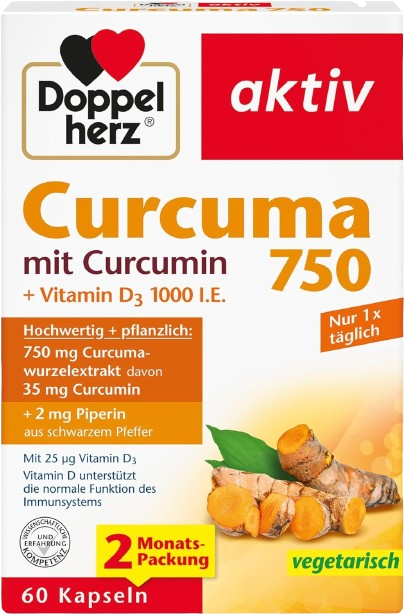 Den letzten Platz unseres Vergleichs belegt das Doppelherz Kurkuma mit Curcumin. Trotz des augenscheinlich geringen Einstiegspreis von CHF 15.25 für 60 Kapseln kann das Präparat im Preis-Leistungs-Vergleich nicht überzeugen. Eine Kapsel enthält nur magere 35mg Curcumin. Um auf die Tagesdosis von 350mg (wie im Testsieger) zu kommen, müssen hier täglich 10 Kapseln für ingesamt CHF 2.54 eingenommen werden. Leider verwendet Doppelherz unnötige Magnesiumsalze als Trennmittel und veröffentlicht keine unabhängigen Laboranalysen.